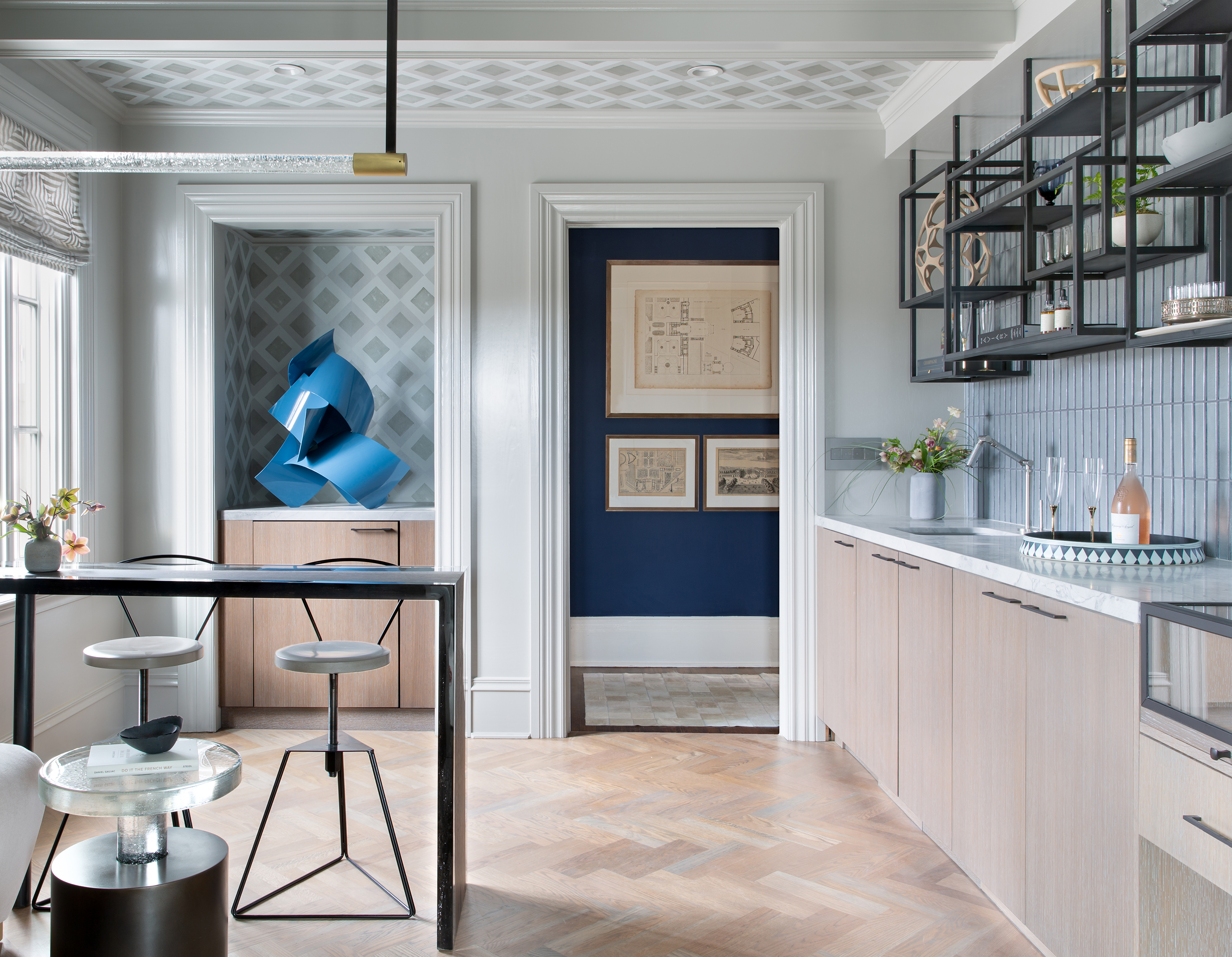 The ultimate lounge to enjoy an aperitif and amuse-bouche with guests. A modern mix of natural elements and earthy textures, with plenty of room to display your glassware, the bar exudes warmth and elegance. The layered, neutral palette enforces restraint while custom lighting adds a touch of luxe and glam.