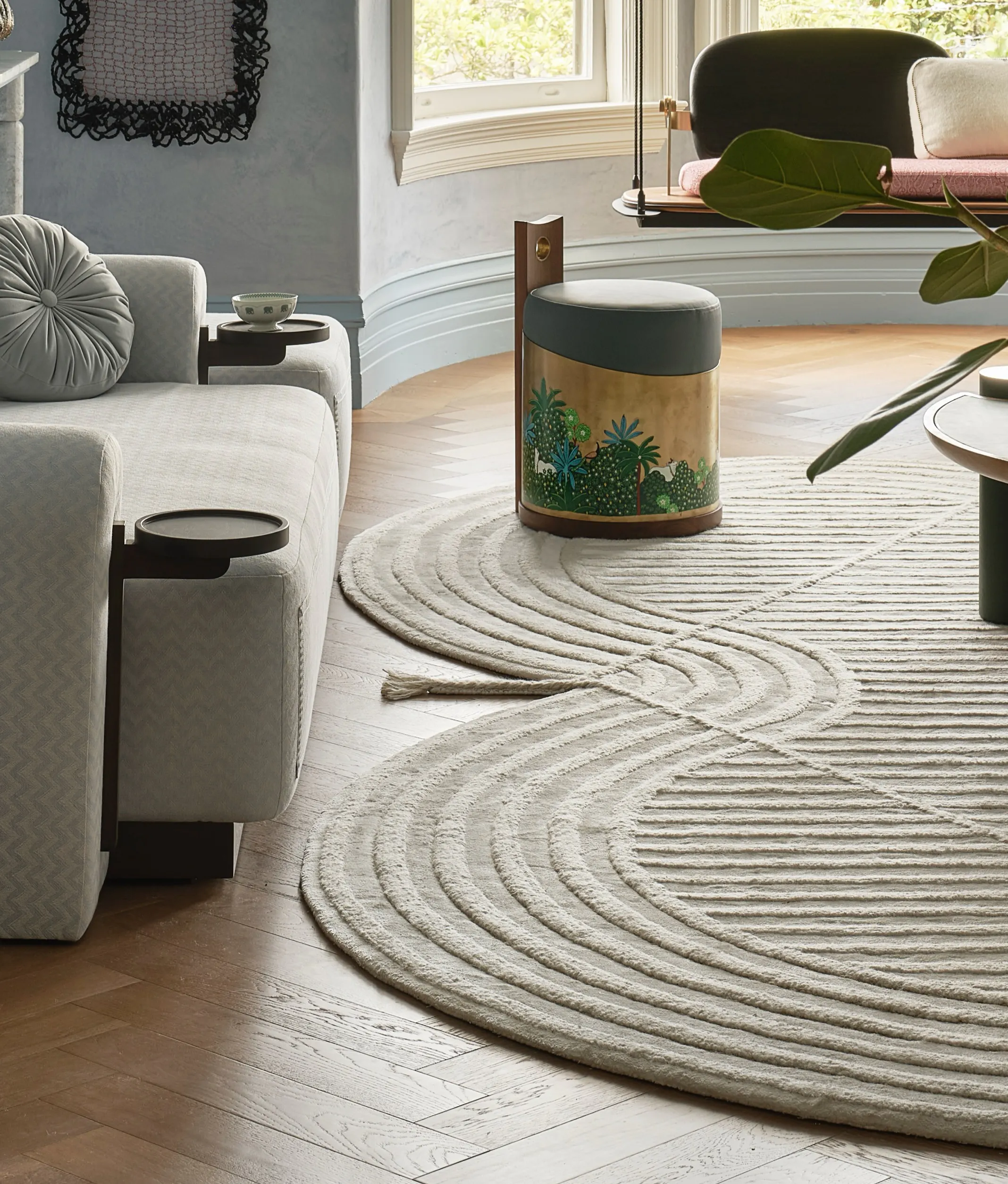Handcrafted in India, the shape of this clover rug is novel. Made from natural jute fibers and plush wool, it’s textural and soft underfoot. Also features braided detailing. Available in any color and custom size.