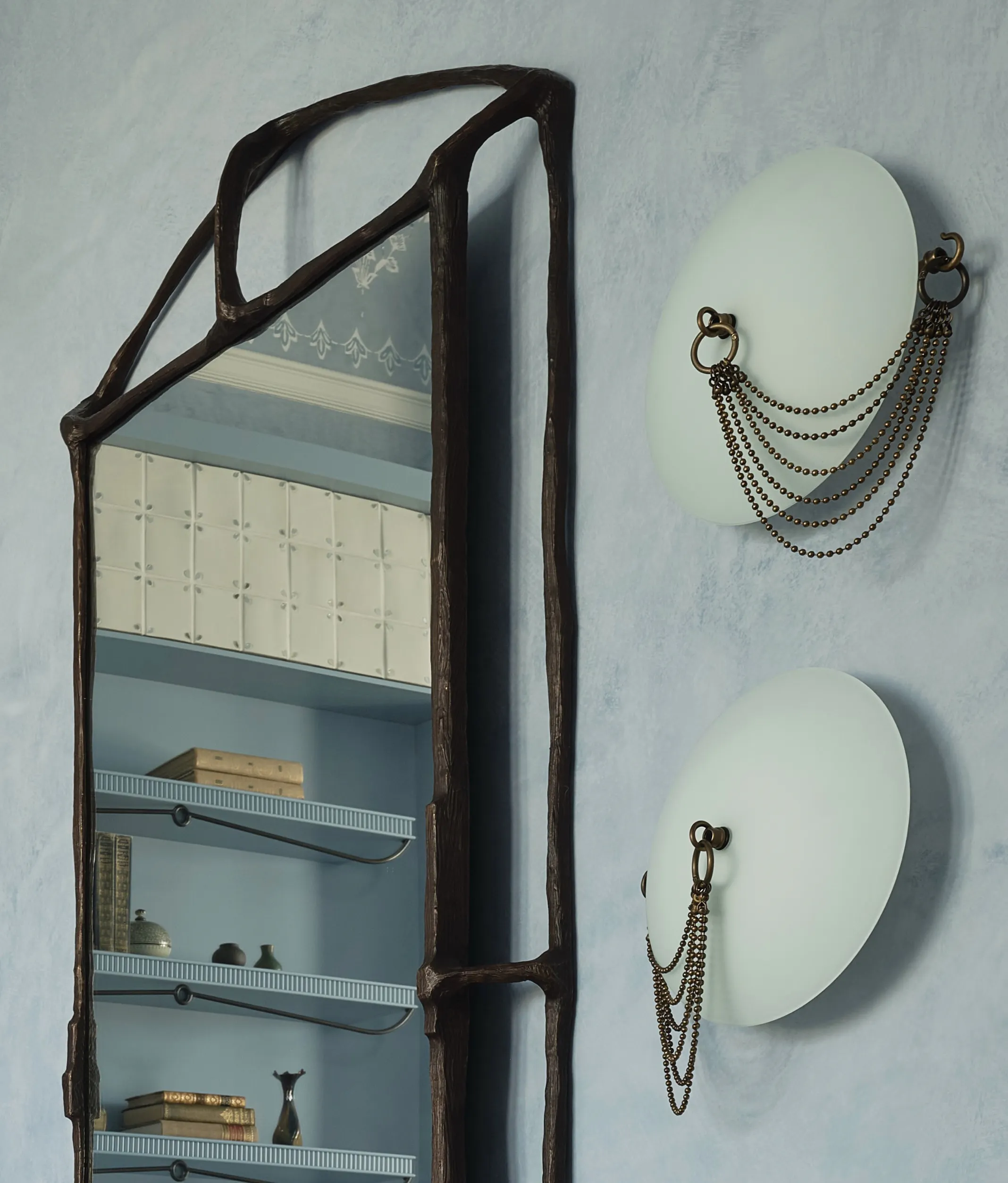 Inspired by the intricate beauty of Indian jewelry, the Nath Sconce merges refined ornamentation with contemporary design. When illuminated, it casts a sultry silhouette that adds an air of elegance and character to any room.